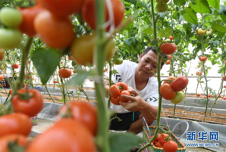 Ein Dorfbewohner pflückt Tomaten im Dorf Tangwan in der Gemeinde Chuanshan.