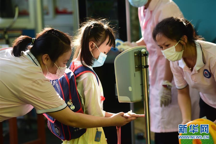 Am Eingang eines Kindergartens in der Stadt Qionghai in der südchinesischen Inselprovinz Hainan müssen sich alle die Hände waschen und desinfizieren. (Xinhua/Meng Zhongde)