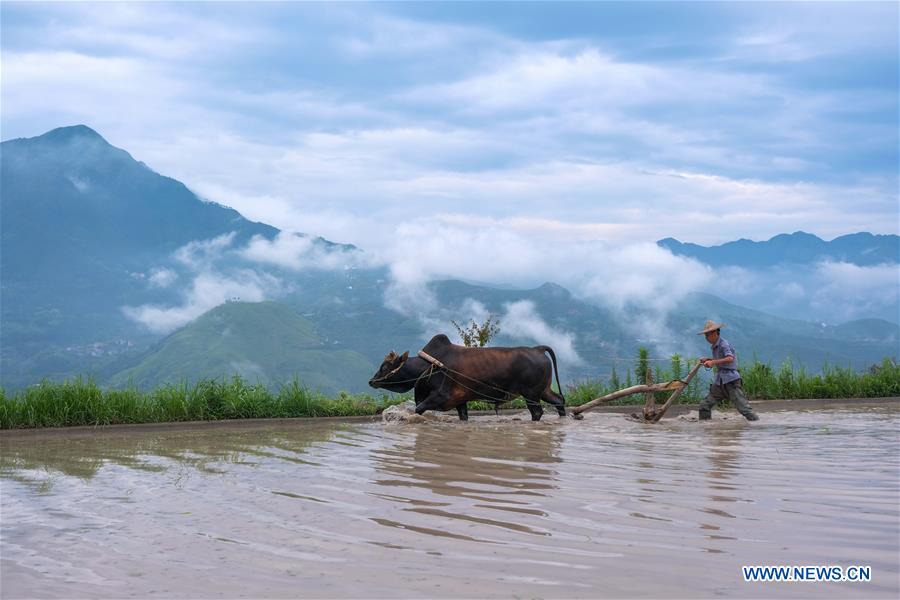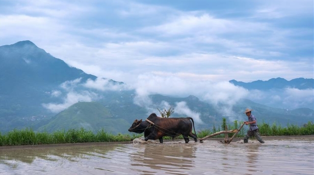 Die Gemeinde Xiaozhoushan liegt im Kreis Qingtian in der ostchinesischen Provinz Zhejiang. Im Juni wird hier der Raps in den Terrassen des Hochgebirges geerntet und anschließend beginnt die Saison für den Reisanbau. Bauern tragen Bambus-Hüte und treiben Rinder, um den Ackerboden zu pflügen. Zudem legen sie Karpfen in die Reisfelder ein.