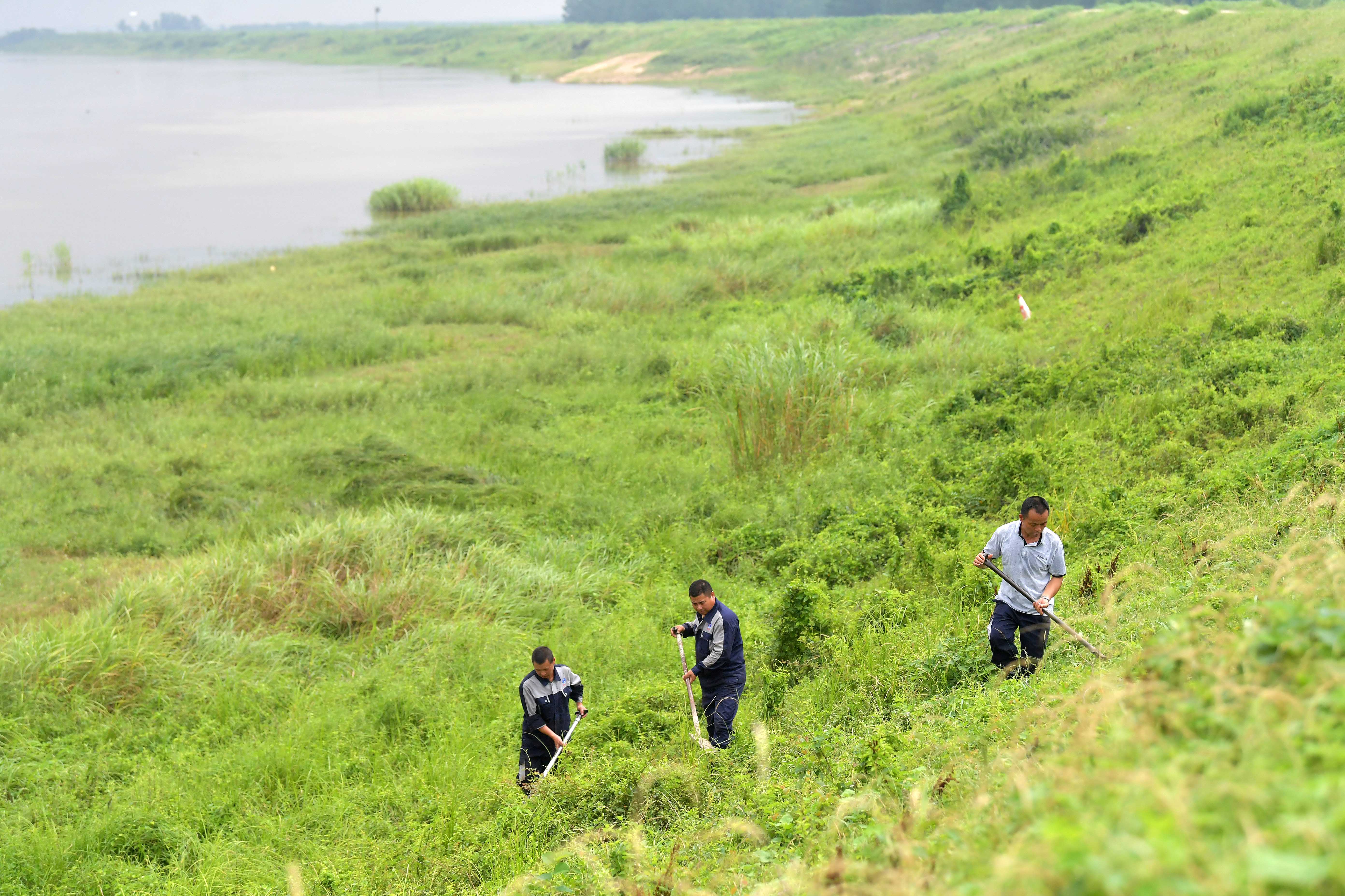 Mitarbeiter patrouillieren am 11. Juni 2020 auf einem Deich entlang des Ganjiang-Flusses in der Gemeinde Jiangxiang in der ostchinesischen Provinz Jiangxi, um sicherzustellen, dass er vor Überschwemmungen geschützt ist.
