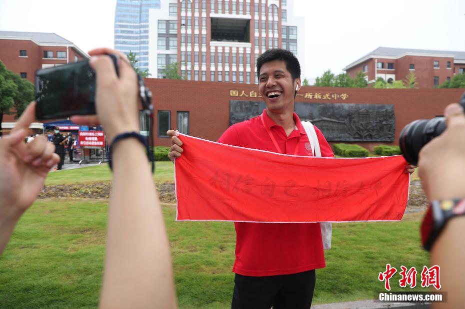 Ein Lehrer in Shanghai nimmt einen Stoffbanner, auf dem steht: Zuversicht in sich selbst. (China News Service/ Zhang Hengwei)