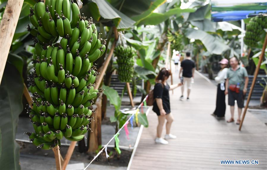 Touristen besuchen ein Gewächshaus für tropische Früchte.