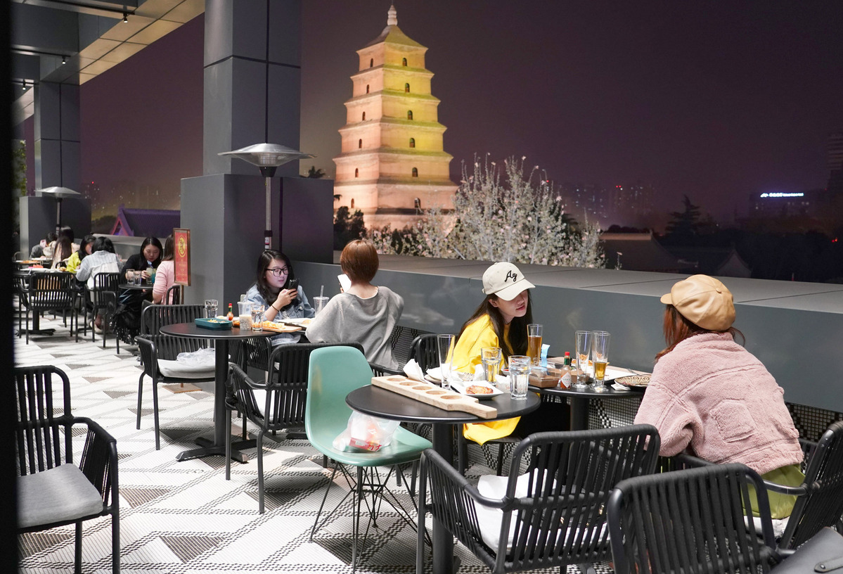 Gäste essen auf der Terrasse eines Restaurants neben dem Dayan-Pagodenplatz in Xi'an in der Provinz Shaanxi, nachdem die Restaurants wieder geöffnet wurden (Foto vom 23. März 2020).