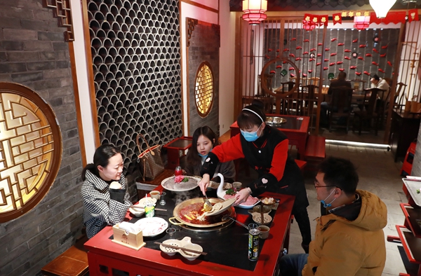 Gäste essen Feuertopf in einem Restaurant in Chengdu, nachdem es wiedereröffnet wurde.
