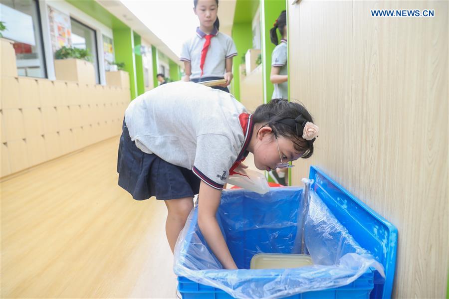 Eine Schülerin an einer Grundschule im Bezirk Changning in Shanghai bringt nach dem Mittagessen ihren Teller in den Recyclingbereich. (Foto vom 2. September, Xinhua/ Ding Ting)