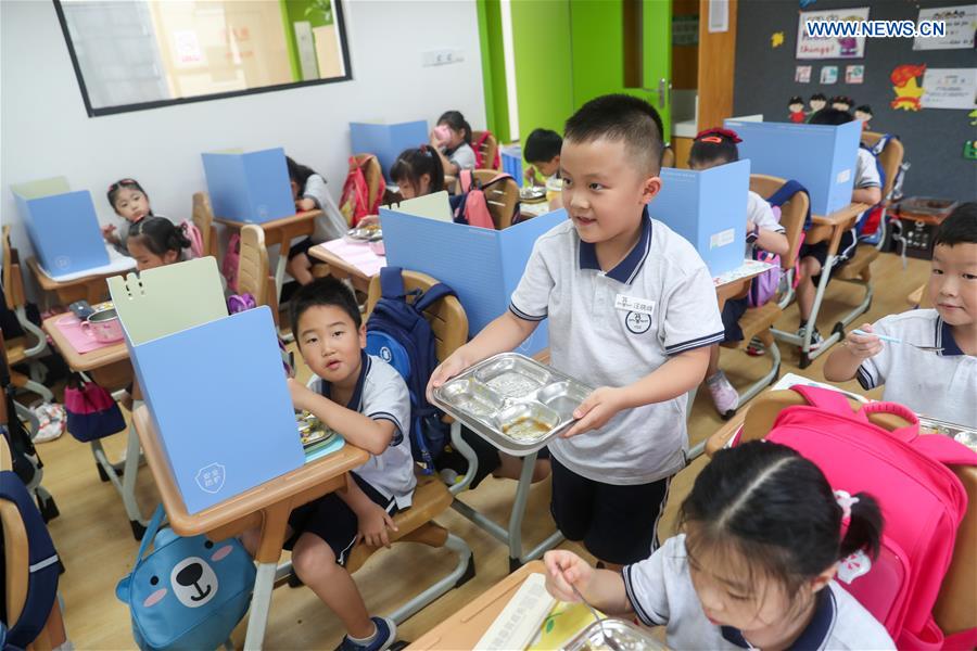 Ein Schüler an einer Grundschule im Bezirk Changning in Shanghai bringt nach dem Mittagessen seinen Teller in den Recyclingbereich. (Foto vom 2. September, Xinhua/ Ding Ting)