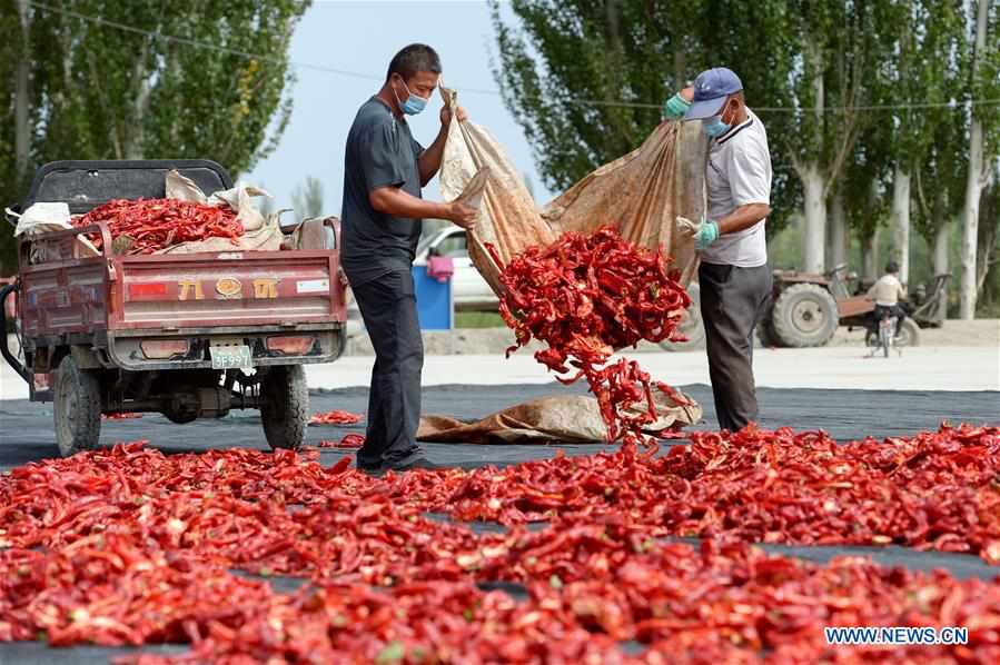 Landwirte lüften Chilis im Dorf Dongdahan im Bezirk Bohu.