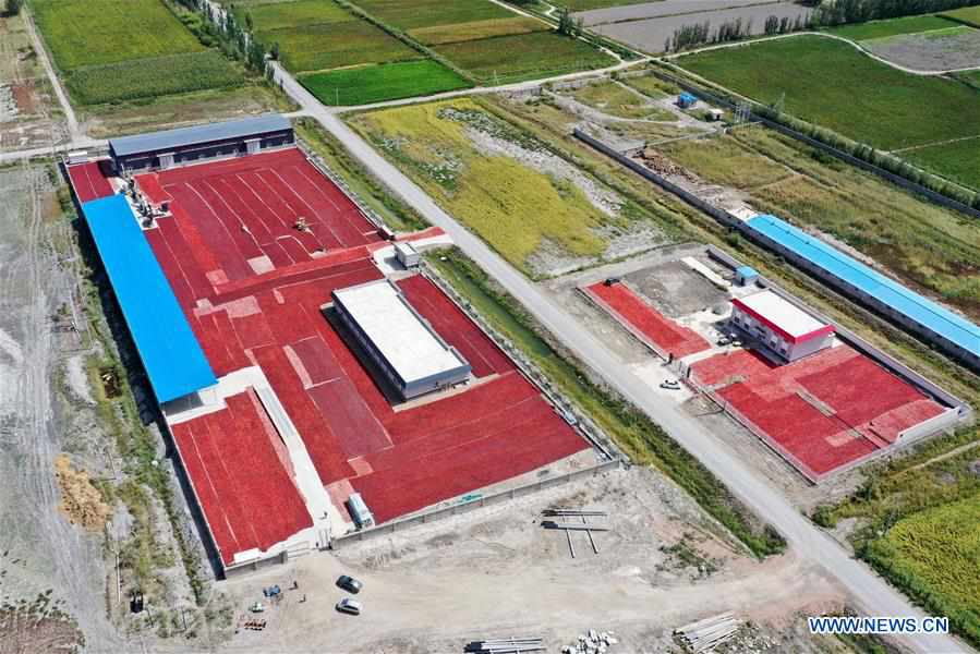 Die Luftaufnahme vom 1. September 2020 zeigt gelüftete Chilis im Dorf Dongdahan im Bezirk Bohu.