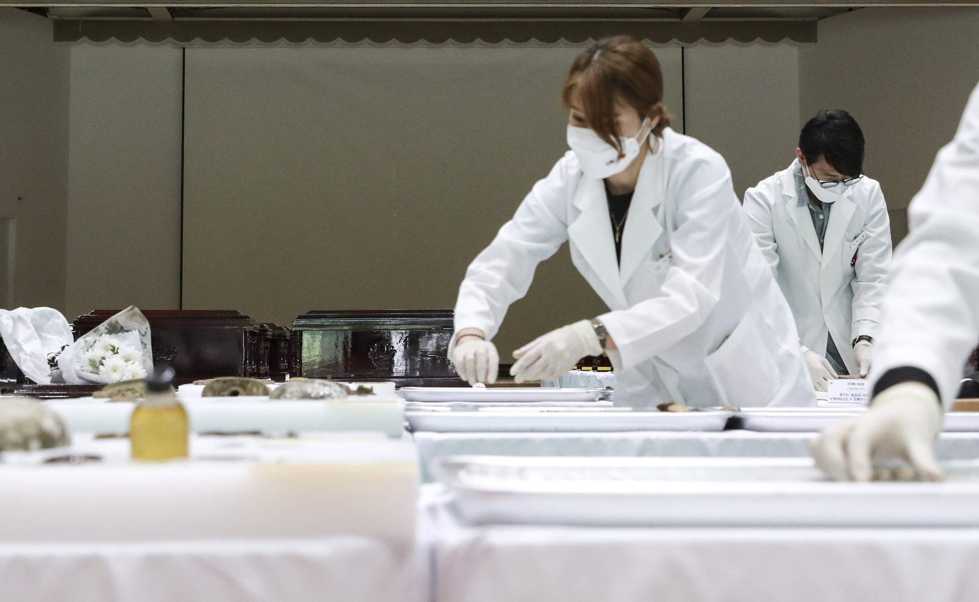 Die südkoreanischen Mitarbeiter legen die Überreste der im Koreakrieg getöteten chinesischen Soldaten in Särge.