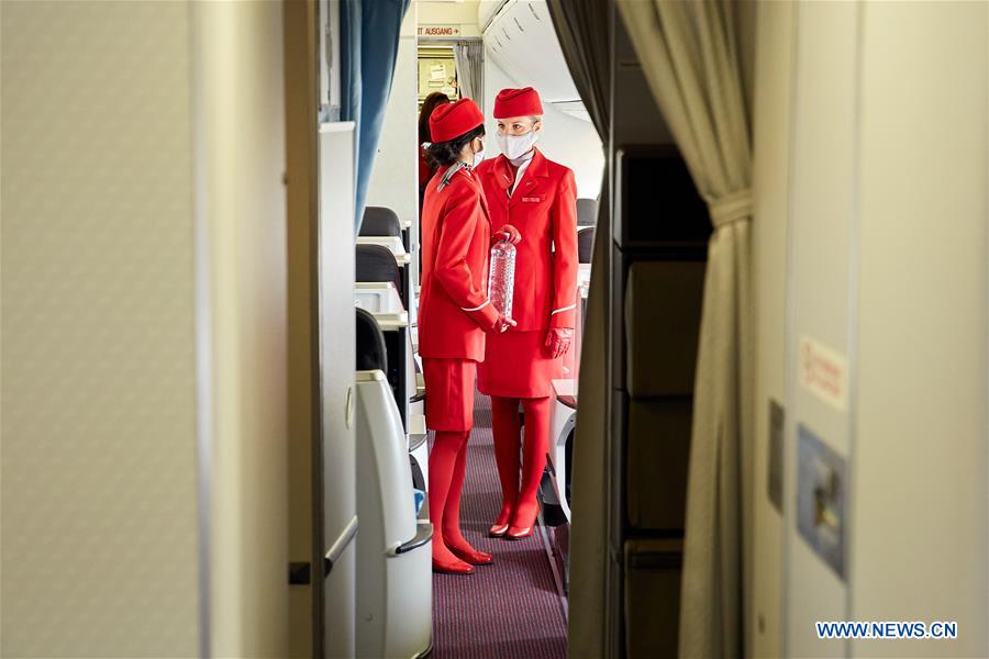 Stewardessen von Austrian Airlines sind vor dem Flug nach Shanghai am 2. Oktober 2020 am Internationalen Flughafen Wien in Schwechat, Österreich, noch mit Vorbereitungsarbeiten beschäftigt. (Foto von Georges Schneider/Xinhua)