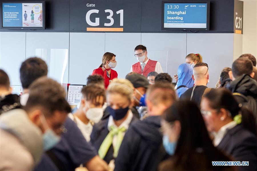 Die Passagiere stehen Schlange, um am 2. Oktober 2020 am Internationalen Flughafen Wien-Schwechat, Österreich, in ein Flugzeug nach Shanghai zu steigen. (Foto von Georges Schneider/Xinhua)