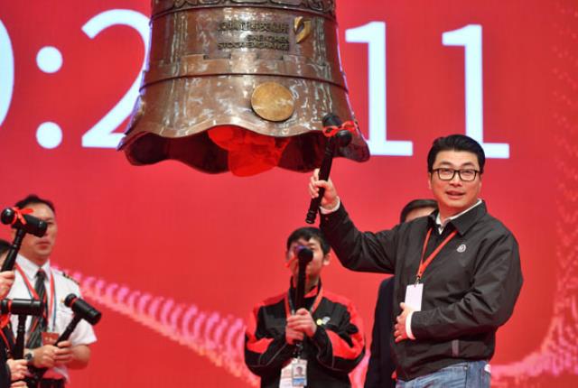 Wang Wei (rechts), Vorsitzender und Gründer der SF Holding, läutet die Glocke an der Börse von Shenzhen anlässlich der Zeremonie der Börsennotierung des Liefergiganten in der südchinesischen Provinz Guangdong. [Foto von Yu Ge/For China Daily]