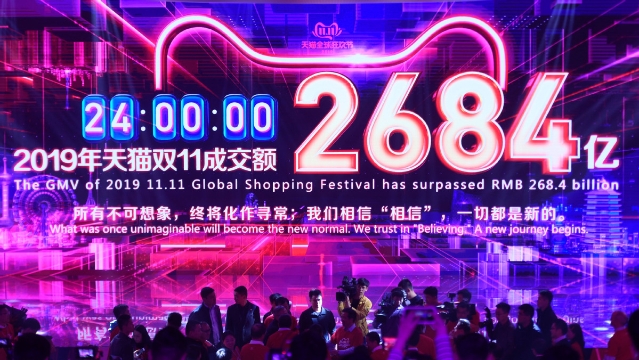 Der Riesenbildschirm im Medienzentrum der Alibaba-Gruppe in der Stadt Hangzhou zeigt, dass Alibabas E-Commerce-Plattform Tmall am 11. November 2019, dem sogenannten Singles' Day (ein beliebtes Online-Shopping-Event), einen Umsatz von 268,4 Milliarden Yuan (etwa 38,3 Milliarden Dollar) erzielte. (Foto/Xinhua)