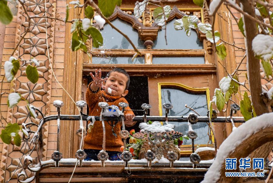 Ein Junge in Kashgar versucht, mit seiner Hand die Schneeflocken zu berühren.