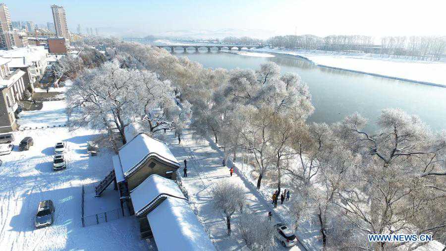 Die Luftaufnahme vom 22. November 2020 zeigt die Landschaft mit den von Raureif bedeckten Bäumen entlang des Mudanjiang-Flusses in der nordostchinesischen Provinz Heilongjiang.
