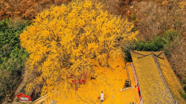 Jetzt ist die beste Zeit, um den alten Ginkgo-Baum zu bewundern, da sich die Blätter im frühen Winter golden verfärben. Die weite Ausdehnung des alten goldenen Ginkgo-Baums im Taoistischen Tempel Shengshui und die heruntergefallenen Blätter bieten einen atemberaubenden winterlichen Anblick.