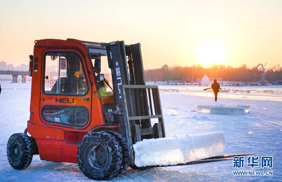 Am Songhua-Fluss werden Eisblöcke gesammelt, um verschiedene Sehenswürdigkeiten innerhalb der Stadt zu dekorieren. (Wang Song/ Xinhua)