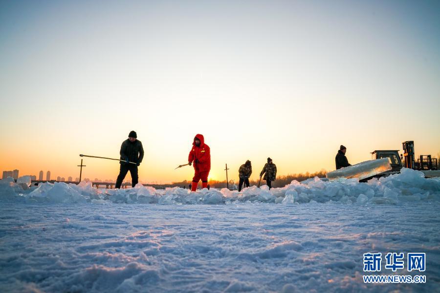 Am Songhua-Fluss werden Eisblöcke gesammelt, um verschiedene Sehenswürdigkeiten innerhalb der Stadt zu dekorieren. (Wang Song/ Xinhua)
