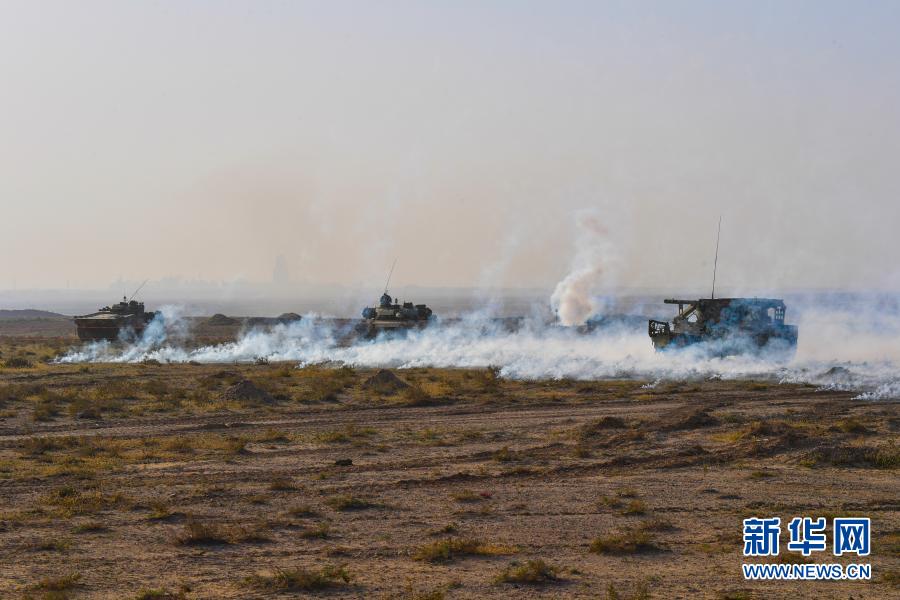Offiziere und Soldaten der Roten Kompanie einer Brigade nehmen an einer rot-blauen Konfrontationsübung in der Wüste Gobi teil (Foto vom 9. Oktober).