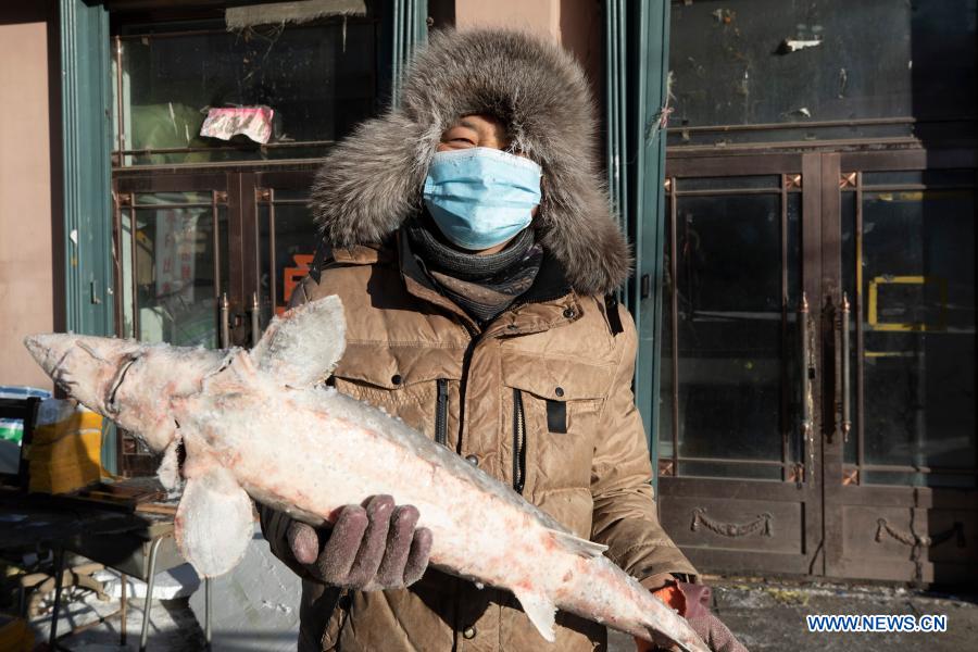Ein Mann zeigt einen gefrorenen Fisch auf dem Fischmarkt in Fuyuan.