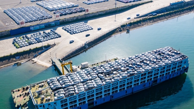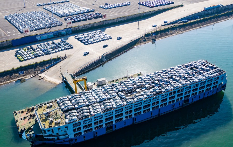 Die Luftaufnahme vom 13. November 2020 zeigt Fahrzeuge, die am Hafen Zigui in Yichang in der zentralchinesischen Provinz Hubei transportiert werden. [Foto: Xinhua]