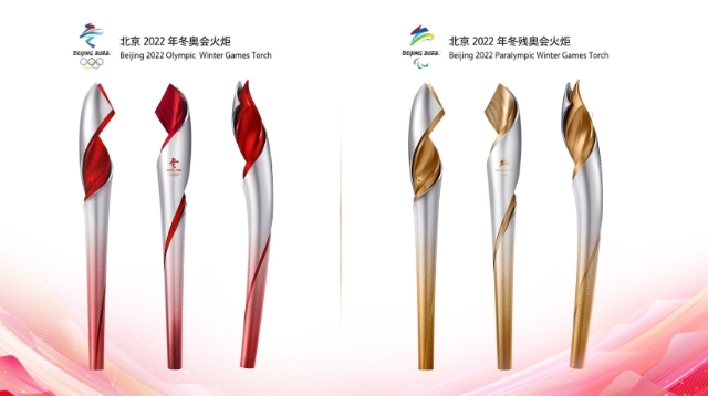 Die olympische Fackel 2022 windet sich spiralförmig nach oben und ähnelt zwei sich überlappenden, flatternden Bändern. Die zweifarbige Fackel strahlt Dynamik und Vitalität aus und stellt eine Metapher aus Eis und Feuer dar, die symbolisiert, wie sie Licht und Wärme in die Wintersportgala bringen wird. Auf der Fackel sind das Emblem von Beijing 2022 und die olympischen Ringe eingraviert. Vom Griff bis zur Flamme sind Muster aus Wolken und Schneeflocken aufgemalt.