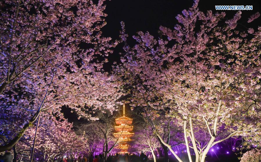 Das Foto zeigt eine Nachtansicht der blühenden Kirschblüten am Ostsee in Wuhan.