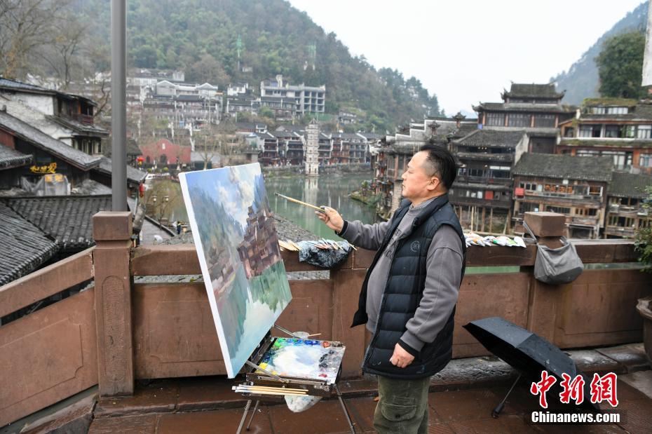 Ein Maler kreiert am 26. Februar eine Landschaftsmalerei in Fenghuang. Die historische Architektur aus der Ming- und Qing-Dynastie in der Stadt hat seit jeher zahlreiche Malerei-Begeisterte und Fotografen zur Inspiration angezogen.