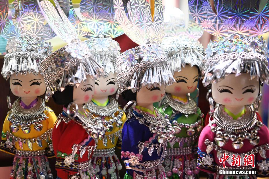 Holzfigürchen in Form von niedlichen Mädchen tragen traditionelle Miao-Kostüme und –Schmuck.