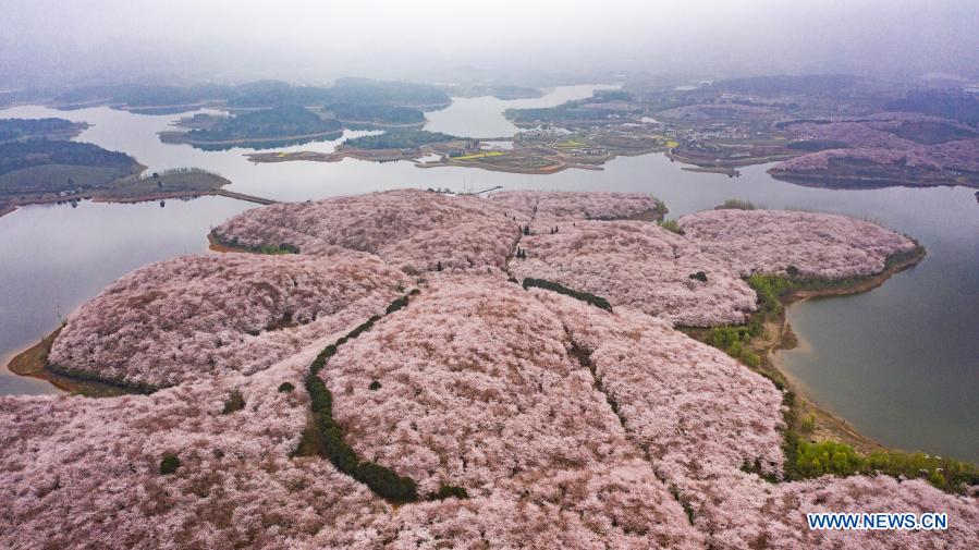 Die Luftaufnahme vom 12. März 2021 zeigt einen Kirschblütenpark im Bezirk Gui'an in der südwestchinesischen Provinz Guizhou.