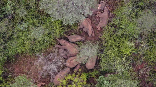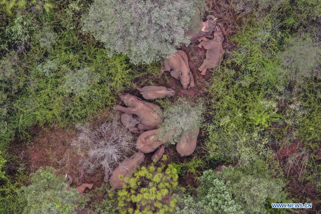 Die Luftaufnahme vom 11. Juni 2021 zeigt eine Herde wilder asiatischer Elefanten im Kreis Yimenin der Stadt Yuxi in der südwestchinesischen Provinz Yunnan. Die wandernde Herde wilder asiatischer Elefanten hat sich am Freitag um 17 Uhr 8,12 Kilometer weiter nach Südwesten bewegt. Sie wurden bei der Gemeinde Shijie im Bezirk Yimen gesehen.(Xinhua)