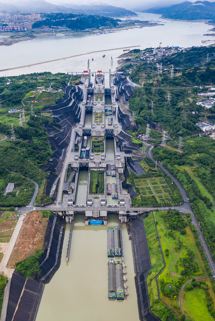 Schiffe passieren ordentlich die fünfstufigen Schleusen des Drei-Schluchten-Staudamms in Yichuang, Hubei. (17. Juni, Foto von VCG)