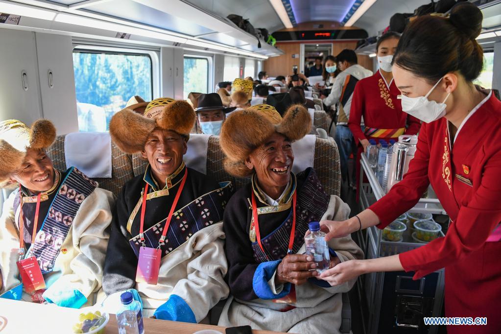 Mitarbeiterinnen bedienen Fahrgäste im Fuxing-Hochgeschwindigkeitszug. (Xinhua/Purbu Zhaxi)