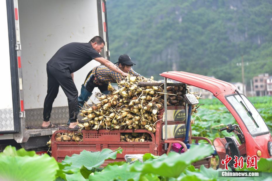 Bauer in Liuzhou sind mit der Ernte der Lotuswurzeln beschäftigt. (China News Service/ Wang Yichao)