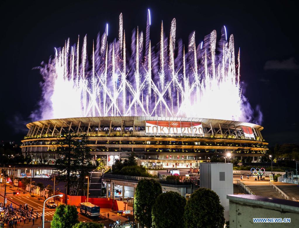 Ein Feuerwerk explodiert über dem Olympiastadion während der Eröffnungsfeier der Olympischen Sommerspiele in Tokio 2020 am 23. Juli 2021 in Tokio. (Xinhua/Liu Dawei)