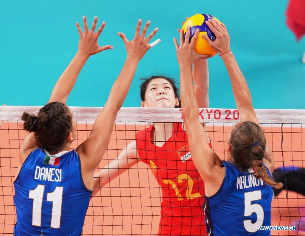 Chinas Li Yingying (Mitte) spielt gegen die Italienerinnen Anna Danesi (1.v.l.) und Ofelia Malinov. (Foto: Xinhua)
