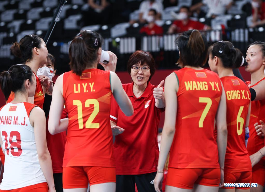 Chinas Cheftrainerin Lang Ping (Mitte) gibt Anweisungen an die Spielerinnen. (Foto: Xinhua)