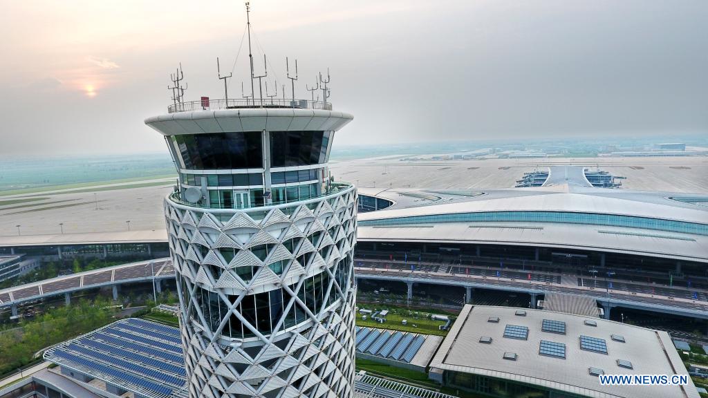 Das Luftbild zeigt den Flugsicherungsturm des Flughafens.