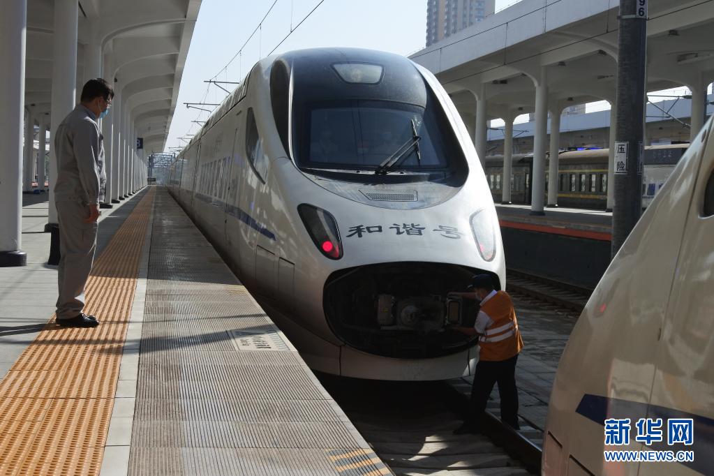 Der erste Zug zum Beginn des Testbetrieb der Hochgeschwindigkeitseisenbahn zwischen Mudanjiang und Jiamusi wartet vor der Abfahrt auf dem Bahnhof Mudanjiang.