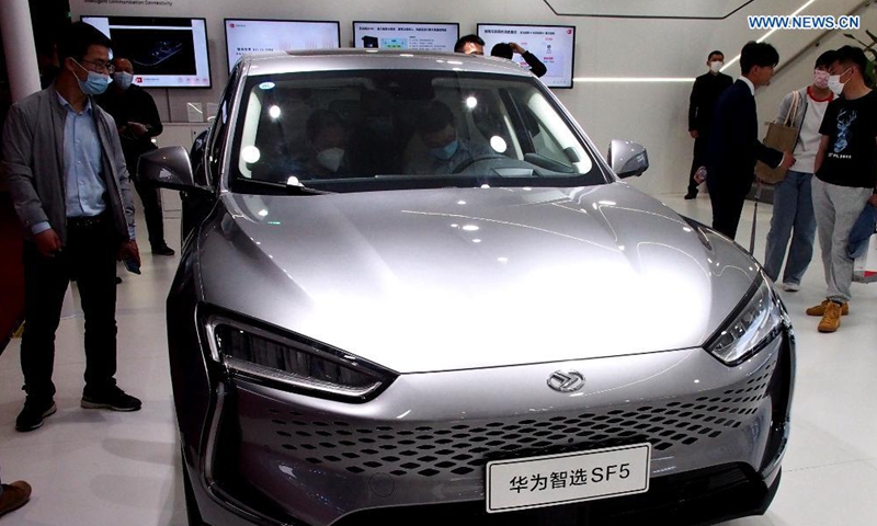 Ein mit künstlicher Intelligenz ausgestattetes Elektrofahrzeug von HUAWEI wird am 28. April 2021 auf der 19. Internationalen Automobilausstellung (Auto Shanghai 2021) in Shanghai ausgestellt. Foto: Xinhua