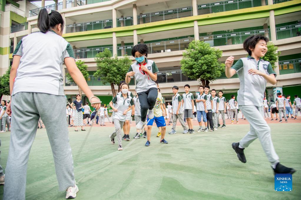 Schüler springen Seil in einer Grundschule in Wuhan.