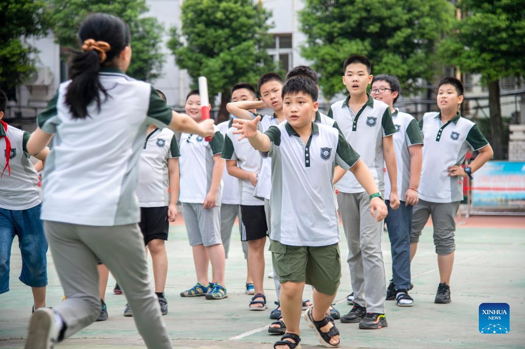 Schüler nehmen an einem Staffellauf in einer Grundschule in Wuhan teil.