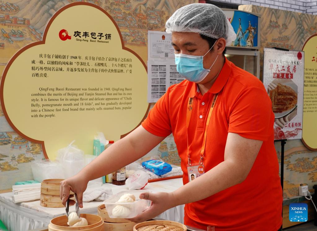 Ein Aussteller bereitet in der Sonderzone für altehrwürdige Marken Dampfbrötchen für Kunden zu.