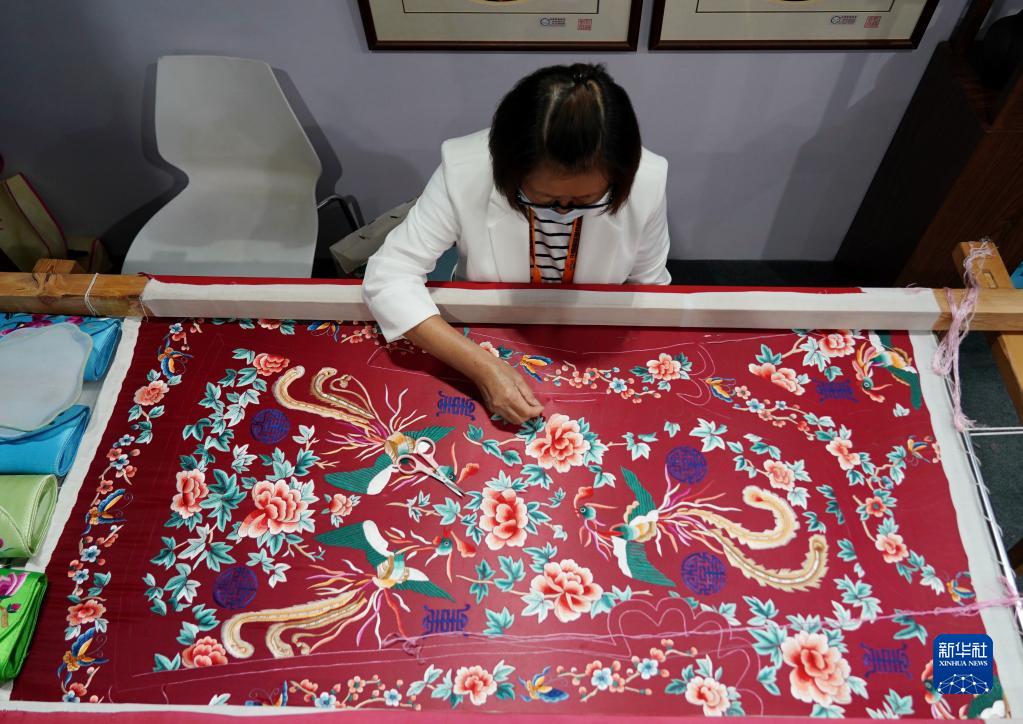 Die Beijing-Stickerei-Meisterin zeigt ihre Handwerke.