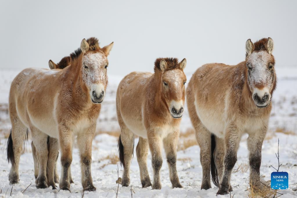 Przewalskipferde suchen im Kalamaili-Naturreservat nach Futter. (Xinhua/Zhang Hefan)