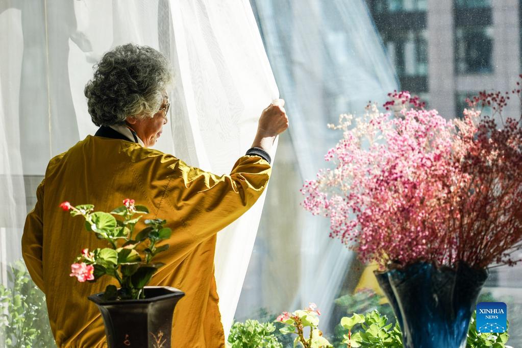 Li zieht den Fenstervorhang zu Hause in Beijing zu, bevor sie ins Pflegezentrum geht. 11. Oktober 2021