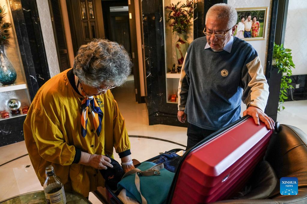 Lü (R) und Li packen das Gepäck zu Hause in Beijing, bevor sie am 11. Oktober 2021 ins Pflegezentrum gehen.