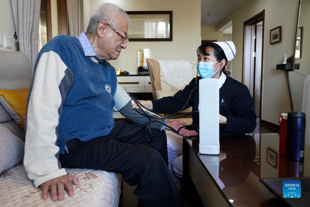 Eine Krankenschwester hilft Lü (L), im Pflegeheim seinen Blutdruck zu messen. 11. Oktober 2021