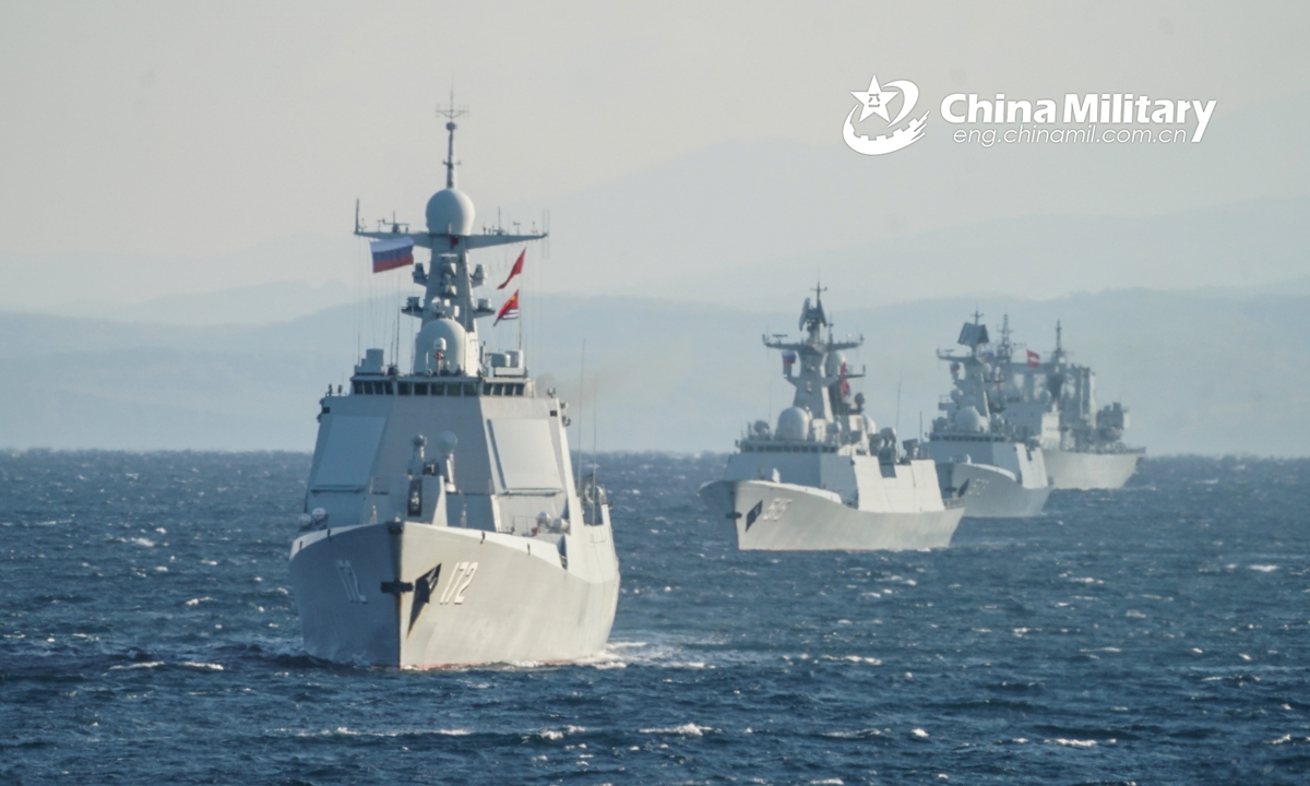 Chinesische und russische Kriegsschiffe durchqueren bei der Marineübung Joint Sea-2021 am Morgen des 15. Oktober simuliertes vermintes Seegebiet. Die chinesisch-russische gemeinsame Marineübung begann am Nachmittag des 14. Oktober in Gewässern nahe der russischen Peter-der-Große-Bucht zu Trainingsthemen wie Kommunikation, Minenabwehr, Luftverteidigung, scharfes Schießen auf maritime Ziele, gemeinsames Manövrieren und gemeinsame U-Boot-Abwehrmissionen. (Foto: China Military)