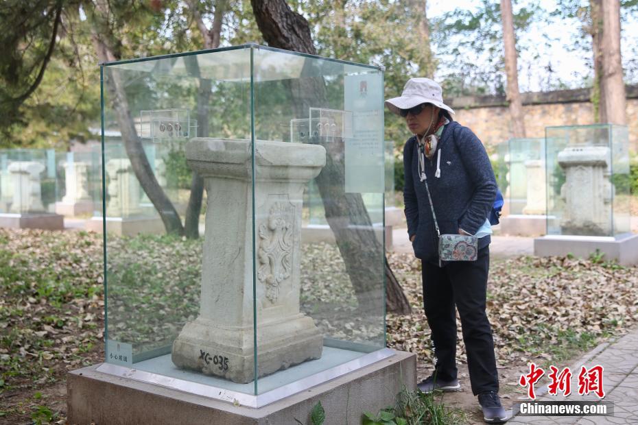 Eine Besucherin bewundert ein Steinkunstwerk mit eingravierten Motiven im westlichen Stil im Alten Sommerpalast. (Yi Haifei/ Chinanews)